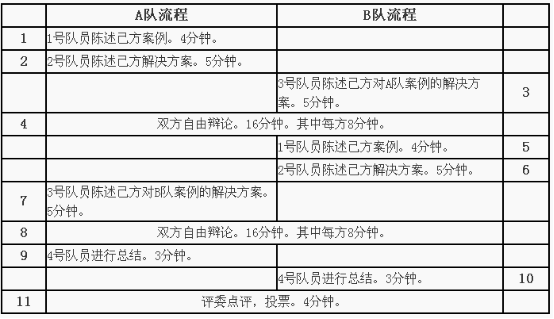 晋级复赛队伍通过抽签两两分组,一对一淘汰。分组双方需互相研究、分析对方在复赛阶段提交的案例及解决方案,并就对方案例提出己方的解决方案,双方通过现场的陈述与辩论展现自身能力水平。