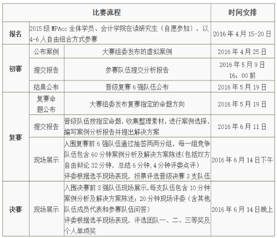 广东外语外贸大学首届MPAcc学生案例大赛定于2016年4月至6月举办,分初赛、复赛、决赛三个阶段。 案例大赛旨在鼓励MPAcc学员体验企业实务、模拟管理决策、比拼解决方案,培养并提升MPAcc学员发现、分析、解决企业实际问题的能力。