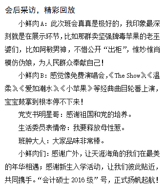 新生入学之际,会计学院为2016级研究生新生开展了一系列入学迎新活动。2016年9月20日、21日及23日,2016级会计学硕、会计专硕ACCA方向及会计专硕CIMA方向三个班级分别在教学楼举办了新生入学班会,2016级会计专硕交流分享会也于9月27日晚顺利举办。本次新生入学系列活动由2015级会计学硕陈怡、刘洁、孙唱策划主持,2016级全体新生研究生参加。此外,在27日晚的会计专硕师长分享会上,我们还荣幸邀请到了MPAcc教育中心主任池海文老师,以及刘明明、左曼婷、曾维东、王晶四位2015级会计专硕优秀学员拨冗为新生进行面对面信息分享。